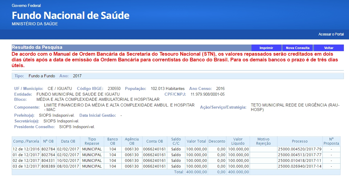 O município de Iguatu passa a contar com reforço de R$ 1,2 milhão para ampliar os serviços de média e alta complexidade (MAC) oferecidos pelo Hospital Regional de Iguatu. Do total desses recursos já foram liberados um montante de R$ 400 mil, e o restante será repassado em oito parcelas até dezembro deste ano.