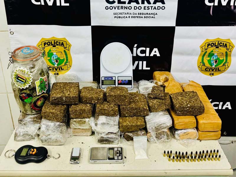 As investigações, conduzidas pela 2ª Seccional de Juazeiro do Norte, chegaram à duas residências, na primeira, localizada no bairro Jardim Gonzaga, foram encontrados 16 quilos de maconha, 30 munições calibre 22, balanças de precisão e outros itens voltados para o tráfico de drogas. No local, um casal foi preso em flagrante, um homem, de 43 anos, e uma mulher, de 52 anos. A mulher é mãe do suspeito que foi capturado no segundo imóvel, localizado no bairro Frei Damião.