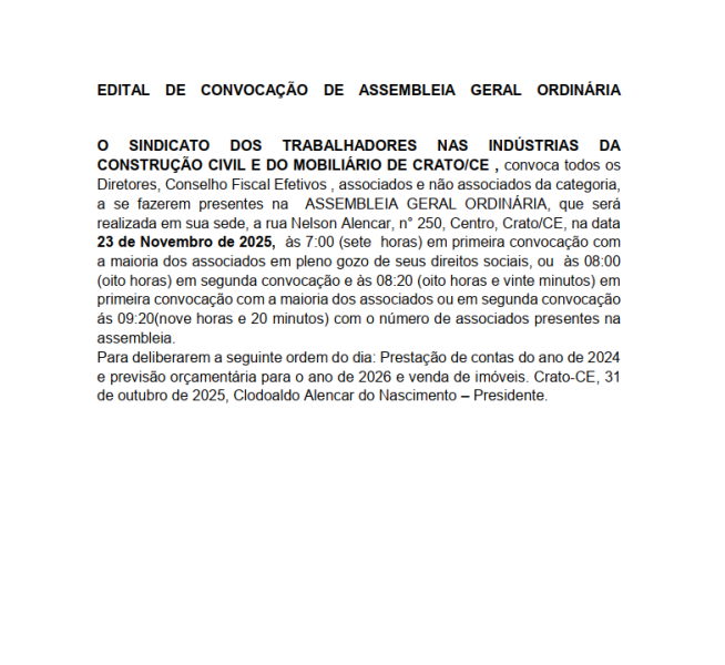O SINDICATO DOS TRABALHADORES NAS INDÚSTRIAS DA CONSTRUÇÃO CIVIL E DO MOBILIÁRIO DE CRATO/CE, convoca todos os Diretores, Conselho Fiscal Efetivos, associados e não associados da categoria, a se fazerem presentes na ASSEMBLEIA GERAL ORDINÁRIA, que será realizada em sua sede, a rua Nelson Alencar, n° 250, Centro, Crato/CE, na data 23 de Novembro de 2025, às 7:00 (sete horas) em primeira convocação com a maioria dos associados em pleno gozo de seus direitos sociais, ou às 08:00 (oito horas) em segunda convocação e às 08:20 (oito horas e vinte minutos) em primeira convocação com a maioria dos associados ou em segunda convocação às 09:20(nove horas e 20 minutos) com o número de associados presentes na assembleia. Para deliberarem a seguinte ordem do dia: Prestação de contas do ano de 2024 e previsão orçamentária para o ano de 2026 e venda de imóveis. Crato-CE, 31 de outubro de 2025, Clodoaldo Alencar do Nascimento – Presidente