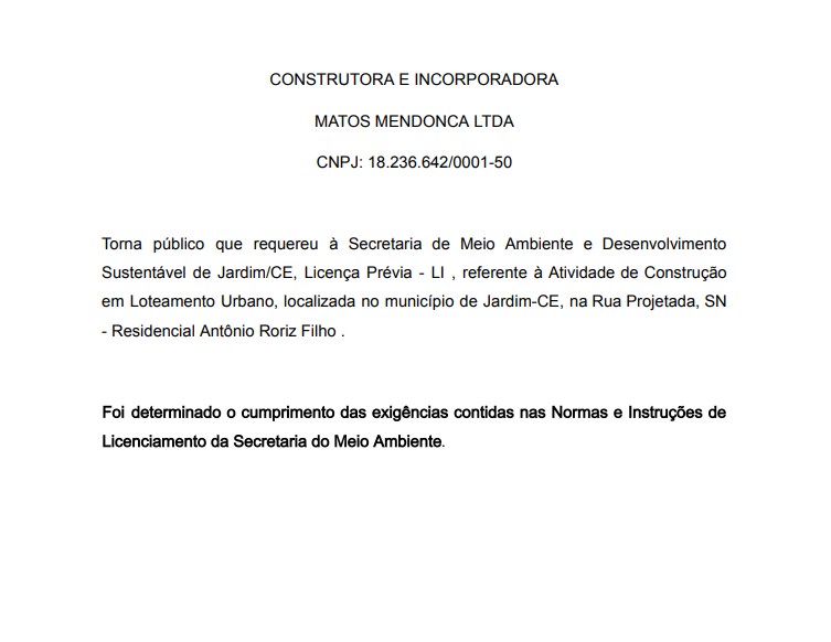 O News Cariri veicula, abaixo, publicação sobre licença de instalação requerida pela Construtora e Incorporadora Matos Mendonça Ltda. à Secretaria de Meio Ambiente e Desenvolvimento Sustentável de Jardim.