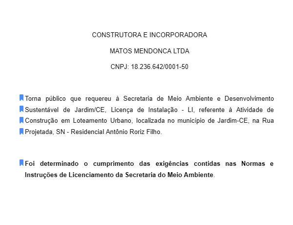 Torna público que requereu à Secretaria de Meio Ambiente e Desenvolvimento Sustentável de Jardim/CE, Licença de Instalação – LI, referente à Atividade de Construção em Loteamento Urbano, localizada no município de Jardim-CE, na Rua Projetada, SN – Residencial Antônio Roriz Filho.