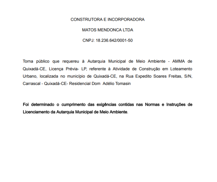 O News Cariri veicula, abaixo, publicação sobre licença prévia requerida pela Construtora e Incorporadora Matos Mendonça à Autarquia Municipal de Meio Ambiente (AMMA) de Quixadá.