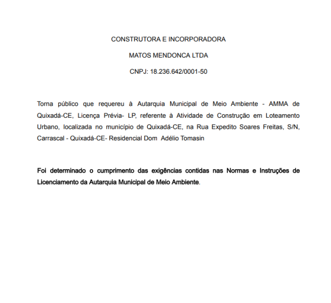 O News Cariri veicula, abaixo, publicação sobre licença prévia requerida pela Construtora e Incorporadora Matos Mendonça à Autarquia Municipal de Meio Ambiente (AMMA) de Quixadá.