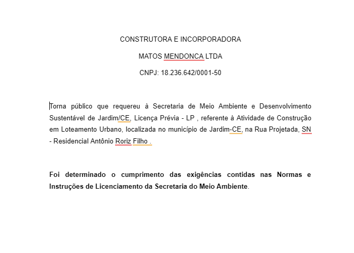 O News Cariri veicula, abaixo, publicação sobre licença prévia requerida pela Construtora e Incorporadora Matos Mendonça Ltda. à Secretaria de Meio Ambiente e Desenvolvimento Sustentável de Jardim.