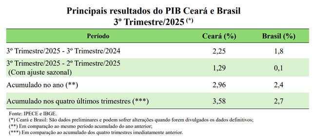 O Produto Interno Bruto (PIB) do Ceará cresceu 2,25% no terceiro trimestre de 2025 em relação ao terceiro trimestre de 2024. O desempenho do PIB estadual na comparação ao trimestre imediatamente anterior (segundo trimestre de 2025), foi de 1,29%. Já o PIB cearense acumulado no ano (janeiro a setembro) ficou em 2,96% e no acumulado dos últimos quatro trimestres atingiu 3,58%. Os números foram divulgados na tarde dessa quinta-feira (18) pelo Instituto de Pesquisa e Estratégica Econômica do Ceará (Ipece).