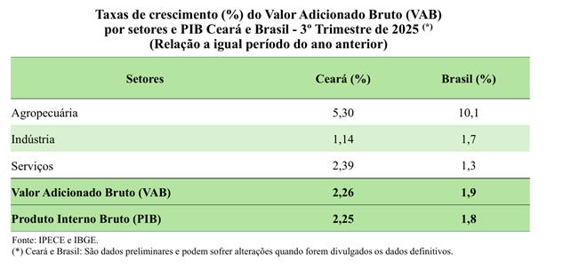Dos três setores que compõem o PIB, Indústria, Serviços e Agropecuária, esse último obteve o melhor resultado. Os números da economia cearense superam os nacionais. O PIB do Brasil foi de 1,8% no terceiro trimestre de 2025 em relação ao terceiro trimestre de 2024; 0,1% comparativamente ao segundo trimestre deste ano; 2,4% no acumulado do ano e de 2,7% no acumulado dos últimos quatro trimestres.