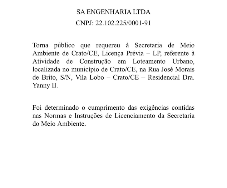 O News Cariri veicula, abaixo, publicação sobre licença prévia requerida pela SA Engenharia Ltda. à Secretaria de Meio Ambiente de Crato.