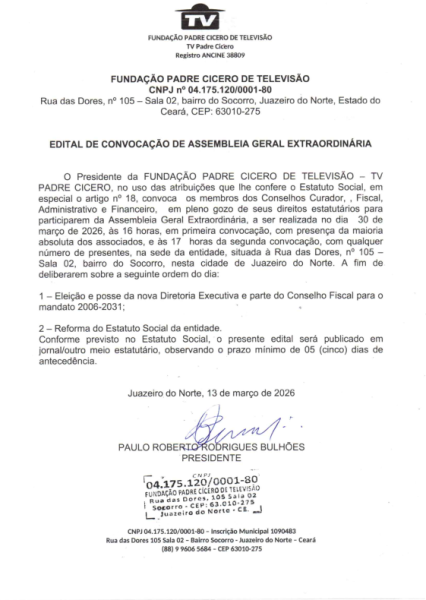 Presidente da FUNDAÇÃO PADRE CICERO DE TELEVISÃO – TV PADRE CICERO, no uso das atribuições que lhe confere o Estatuto Social, em especial o artigo n° 18, convoca os membros dos Conselhos Curador, Fiscal, Administrativo e Financeiro, em pleno gozo de seus direitos estatutários para participarem da Assembleia Geral Extraordinária, a ser realizada no dia 30 de março de 2026, às 16 horas, em primeira convocação, com presença da maioria absoluta dos associados, e às 17 horas da segunda convocação, com qualquer número de presentes, na sede da entidade, situada à Rua das Dores, n° 105 – Sala 02, bairro do Socorro, nesta cidade de Juazeiro do Norte. A fim de deliberarem sobre a seguinte ordem do dia: