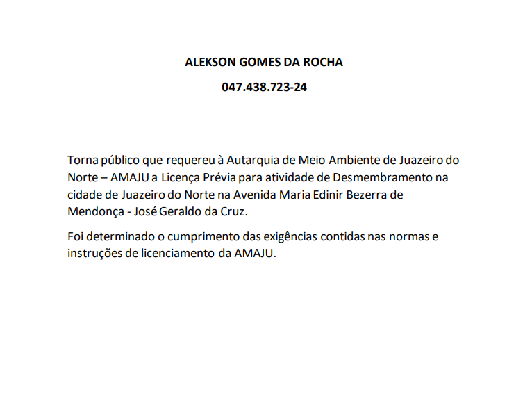 O News Cariri veicula, abaixo, publicação sobre licença prévia requerida pelo sr. Alekson Gomes da Rocha à Autarquia Municipal de Meio Ambiente de Juazeiro do Norte (Amaju).